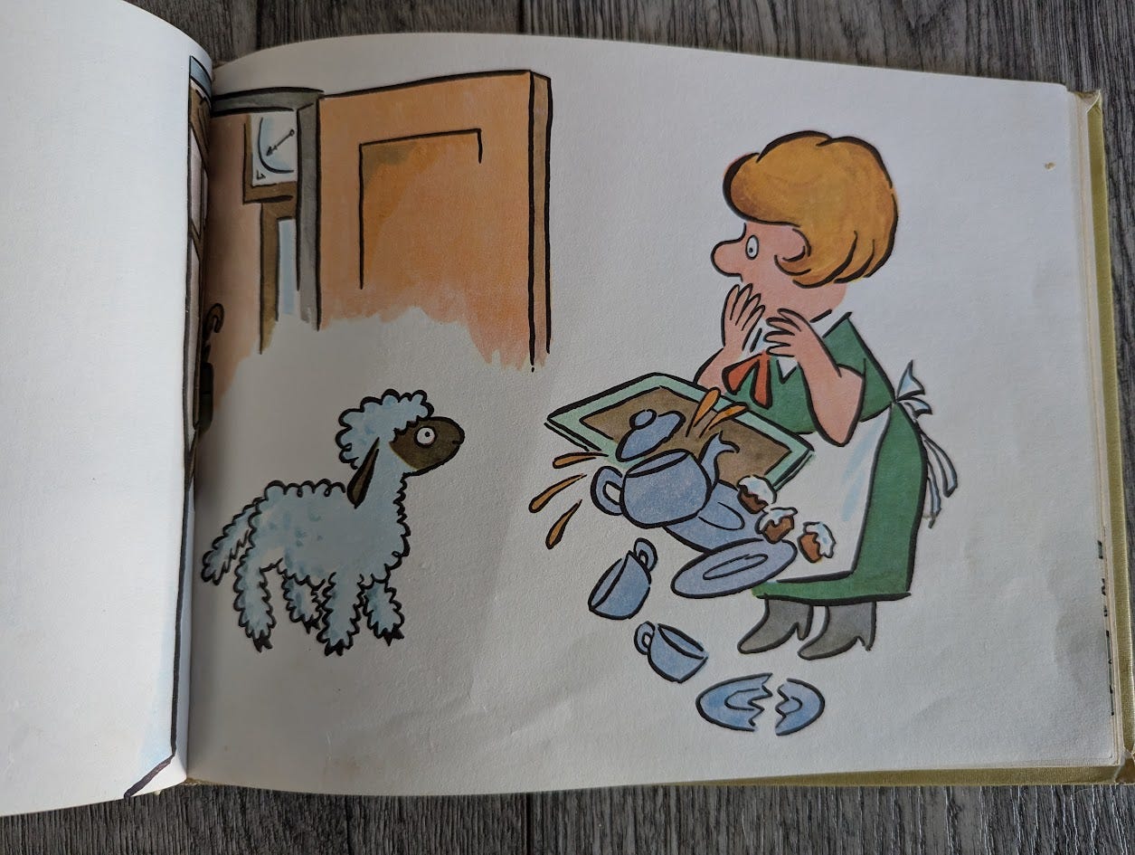 So he goes to the shop and buys a penny magic spell, so he can turn into something else. When he gets home, his mom says, “Where has my little lamb been?”