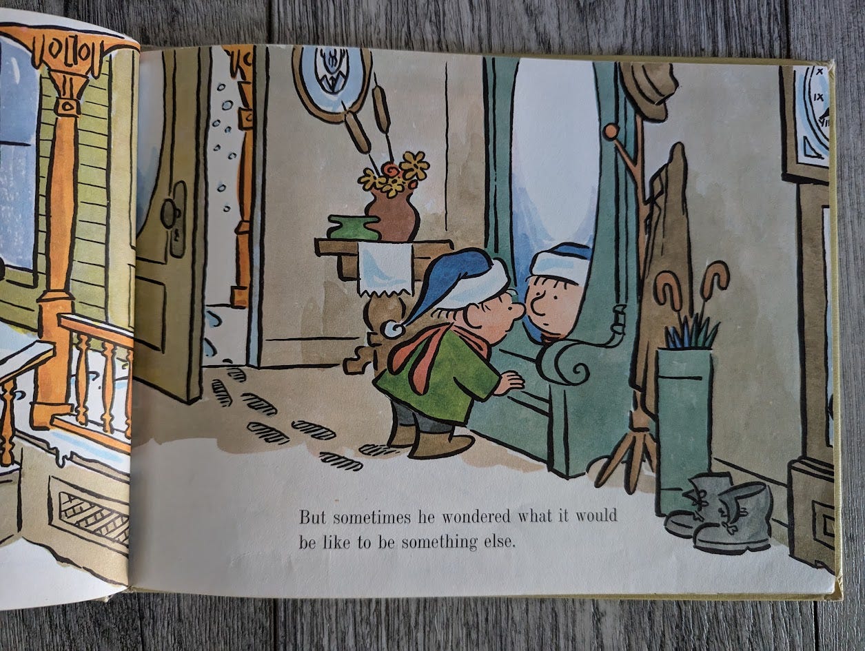 One of my favorite books growing up was Dooly and the Snortsnoot by Jack Kent, which is about a giant who is not giant-sized. As an adult, I went on a bit of a Jack Kent collecting spree, and one of the ones I got is the 1968 book Just Only John. In it, a little boy named John “had been a little boy named John for over four years and he was getting tired of it.”