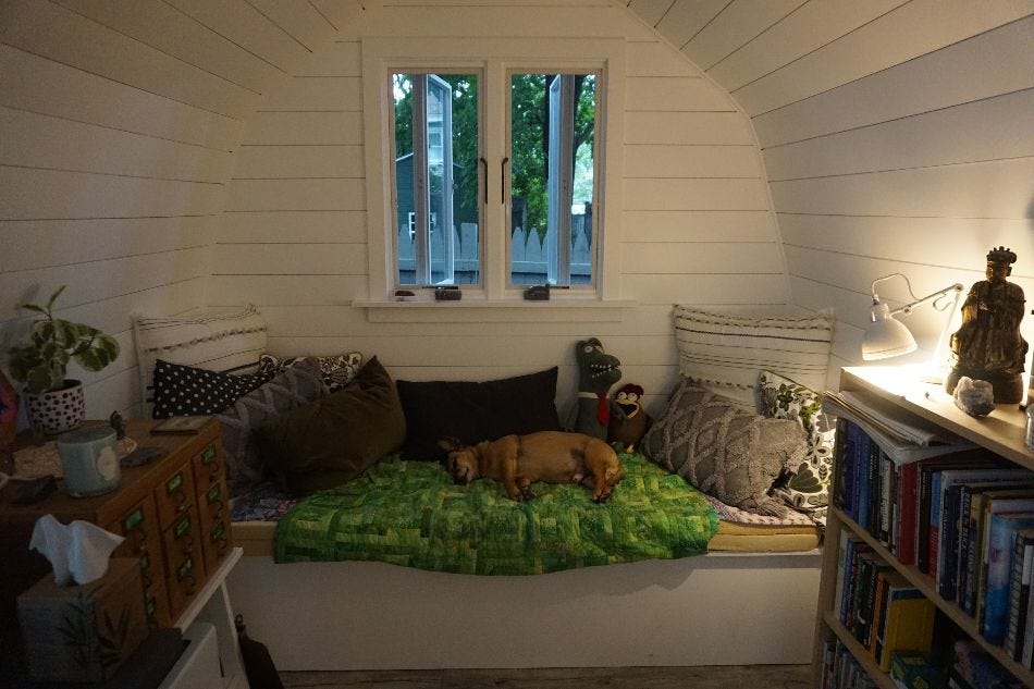 Second, I love your writing shed even more than I already did, somehow! You've shown pics before, of course, but this view looks particularly inviting. Is the bed part a built-in?