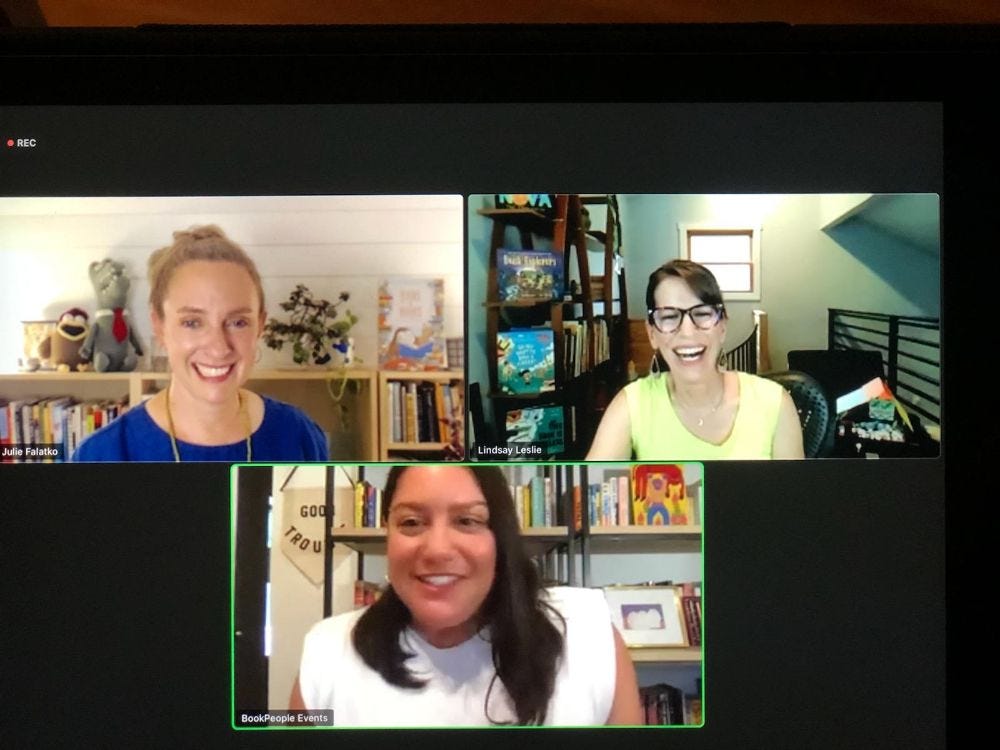 Did you come hear Lindsay Leslie and I talk about our new books with BookPeople on Tuesday? We had a great time talking about how we come up books and our writing processes. Lindsay waits for an idea to really be calling to her before she starts writing, whereas I tend to work on an idea for a bit and then sometimes realize it's not working. Also Lindsay often comes up with titles first, and I usually come up with them last. Lindsay's new book is So You Want to Build a Library, and it's a super fun and imaginative way to think about what you might want in your ideal library, like maybe a sundae bar and a hot tub. If you're in Austin, you can get signed copies of Lindsay's book at BookPeople, and I sent them a bunch of bookplates, so you can get a signed copy of Yours in Books from there, too! (Photo above is by my friend Kim Campbell -- thank you, Kim! Also note how much better my Zoom background is here in the writing shed.)