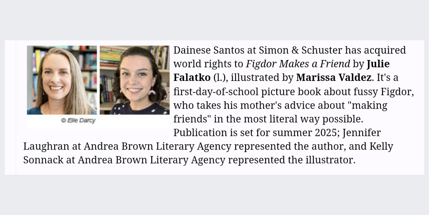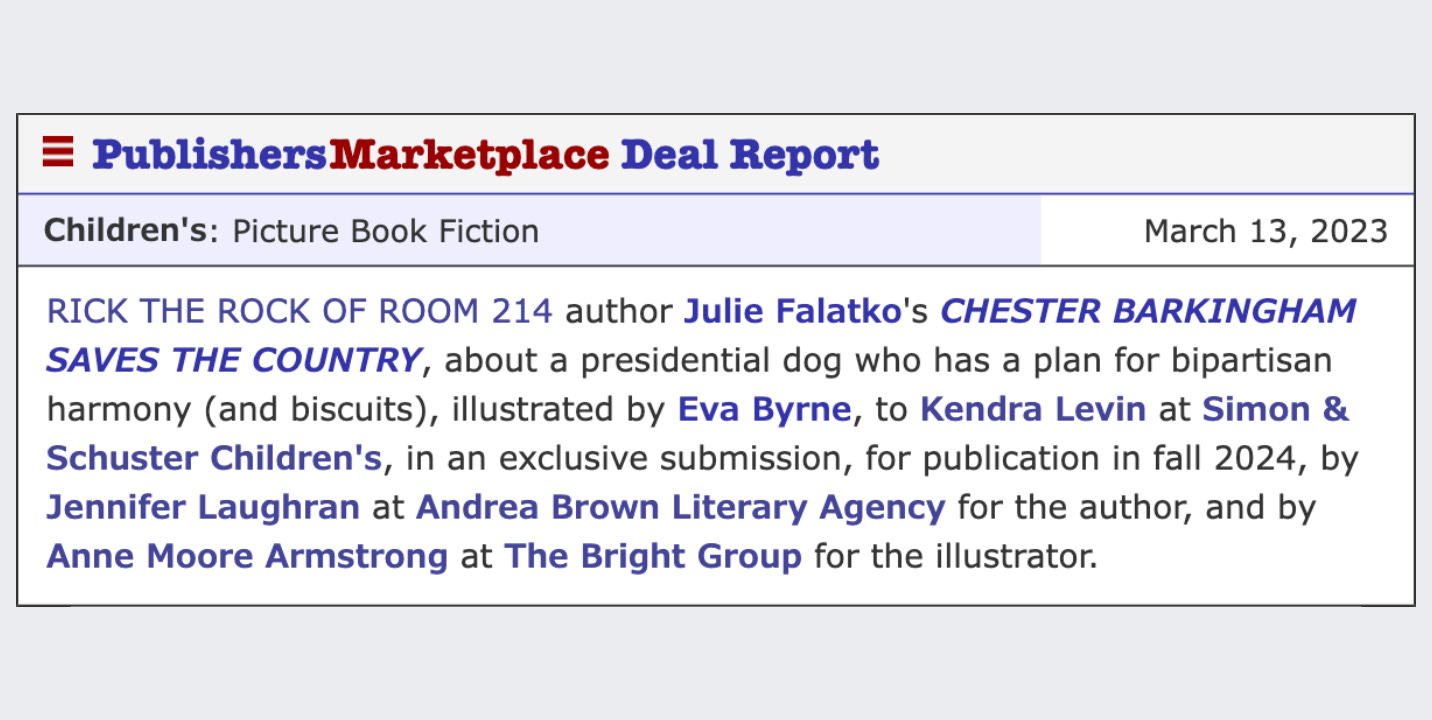 Two of my upcoming picture books were officially announced: Chester Barkingham Saves the Country, which will be illustrated by Eva Byrne and will be out just before the 2024 US Presidential election, and Figdor Makes a Friend, illustrated by Marissa Valdez, and publishing in 2025. Both will be published by Simon & Schuster.