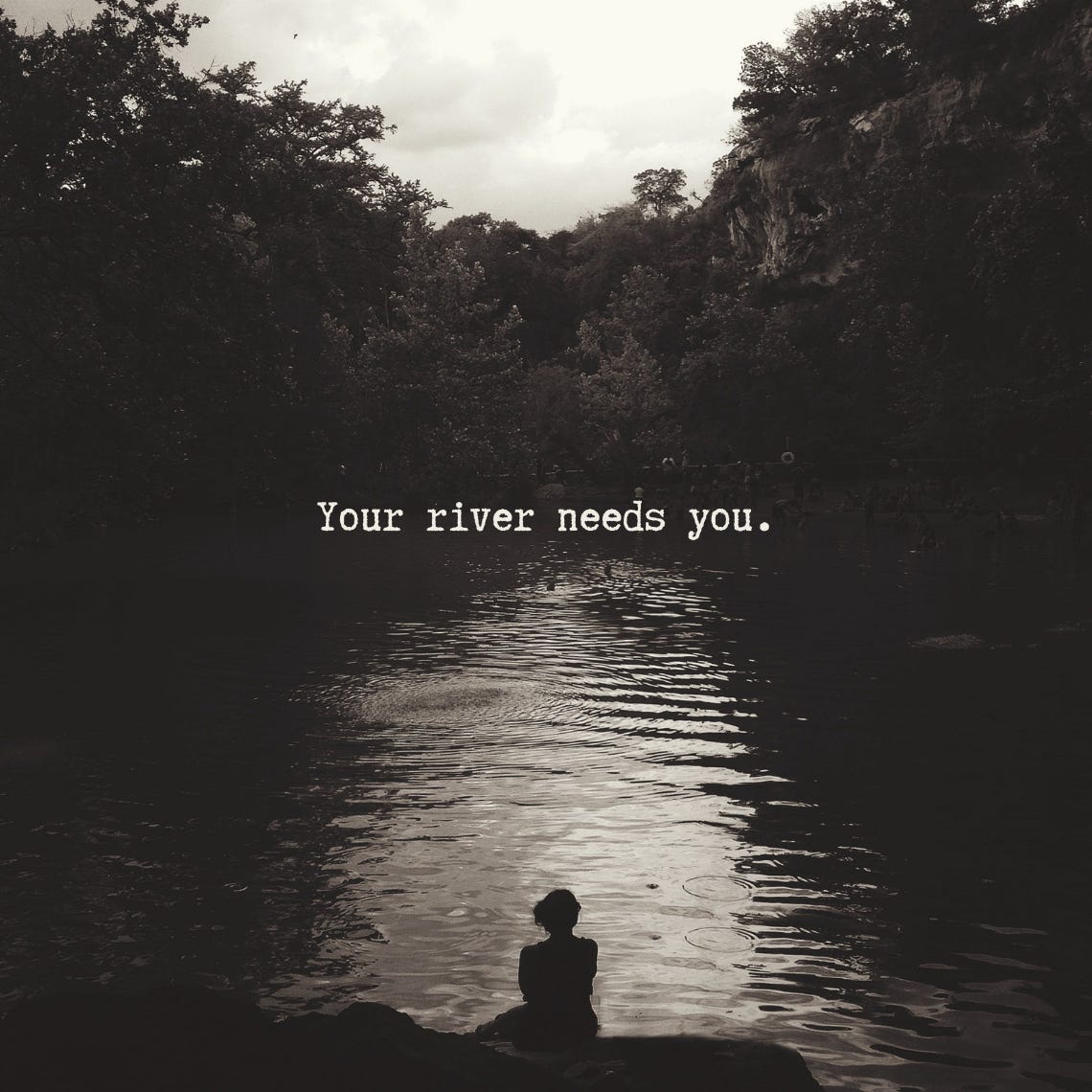 Which brings me to my second point: a lot of us have neglected our rivers in recent years, for understandable reasons. But your river is not a plant. If you neglect it, it does not wither into a trickle. It is always there, always wide and full of rapids. It's loud. Can you see it? See how there are boulders in the middle of it? When you take a break from being in the river, crawl onto one of those boulders. Don't pull yourself out of the water onto the riverbank, where it's tempting to walk away. Be someone who is dreamily in your creative river even when you're not actively making something. When you are spacing out, dreaming, walking (without your phone), meditating, napping, reading (without your phone), cooking (without your phone), showering (without listening to a podcast), you are sunbathing on that rock in the middle of the river. You are still, essentially, in the river, and that's when you get hit with creative inspiration -- when you're in the river. But if you, like many of us, have neglected your river, that means that you walked away. At some point you pulled yourself onto the riverbank, dried yourself off, and went somewhere else. Your goal, if you're serious about making creative work that is inspired and something only you can make (because I also believe that we EACH get a river, there's no river-sharing in this metaphor), is to get back to your river. If you've walked really far away, it might take some time to get back. You may have to commit to distraction-free creative sessions for many weeks before you are even ankle-deep in that river again.