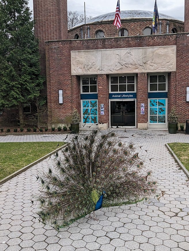 I went to the Prospect Park Zoo with Ruth Chan and my daughter Zuzu and there are free-range peacocks (or, as Zuzu called them “loose birds”) and this one peacocked all over the place at us.