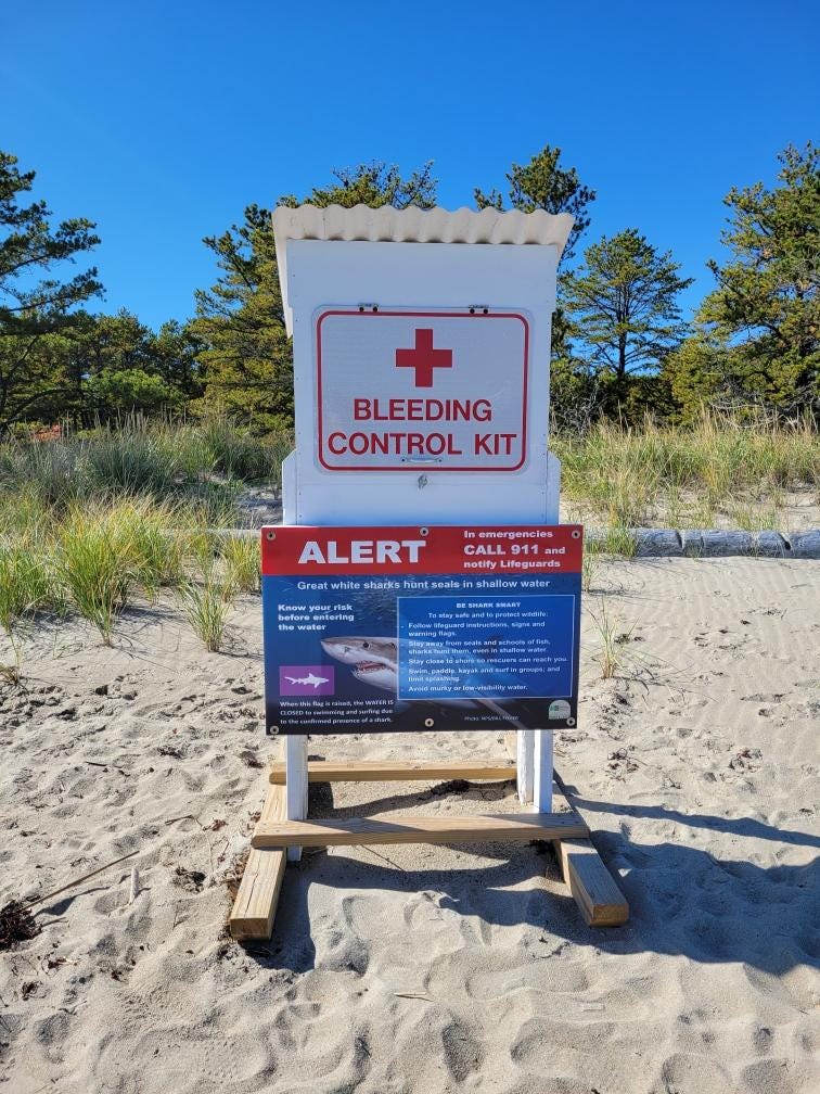 There is a beach near me that has several signs along the path to the sand, warning about the presence of great white sharks. There aren’t a lot of great white sharks in Maine (though there are some), and whoever made these signs wanted to make sure any skeptical New Englanders took this matter seriously, so they installed a very obvious BLEEDING CONTROL KIT near the entrance of the beach. A graphical way of bonking us on the head, to make sure we get it. Plus also, I suppose, a way to control the bleeding.