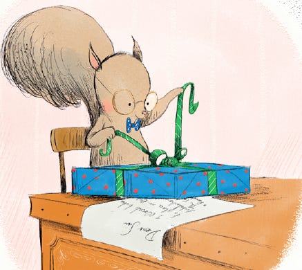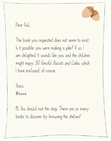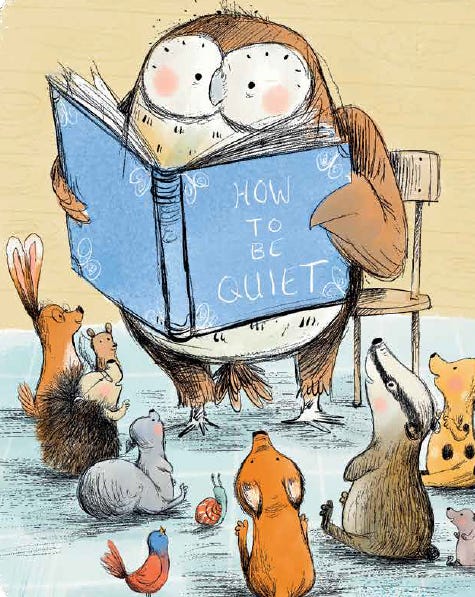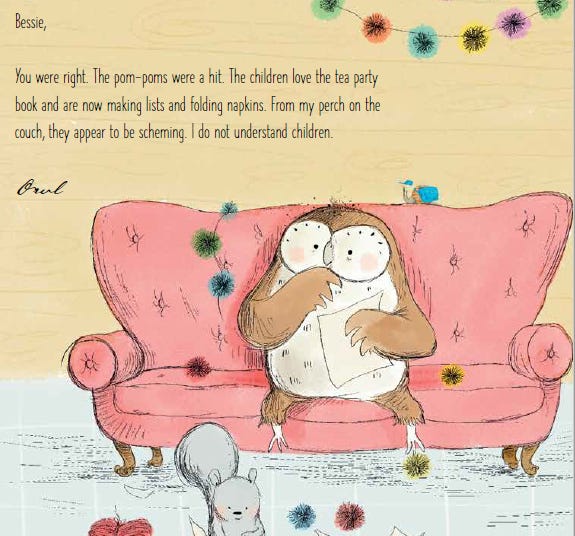 It's the story of a grumpy owl who is just trying to get a moment's peace so he can drink his tea and read a book (can you relate?) but all the noisy neighborhood children keep disturbing him. So he orders books from his local neighborhood bookstore that he thinks might help (like How to Soundproof Your Forest Dwelling and The Can-Do Guide to Moving to a Remote Tropical Island), but the savvy squirrel bookseller sends him not the books he wants, but the books he needs.